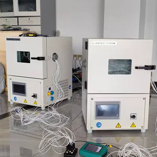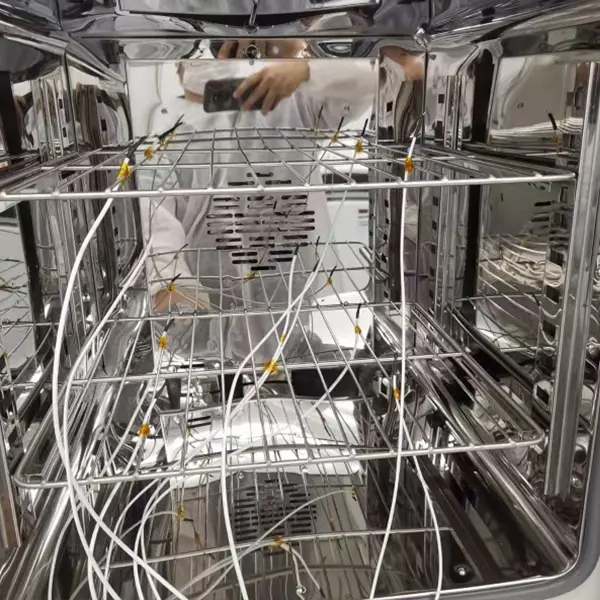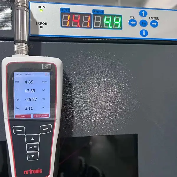 工場から出荷される前に、すべてのテストチャンバーとドライキャビネットは 48 時間以上続く連続老化テストを受けます。各ドライキャビネットには、高精度のロトロニック湿度計で測定された校正証明書が付属し、各テストチャンバーには、ISO17025 認定ラボで測定された 9 ポイント校正証明書が付属しており、国家標準にトレーサブルであり、受け取った機器が正確な「プラグアンドプレイ」性能を発揮することを保証します。