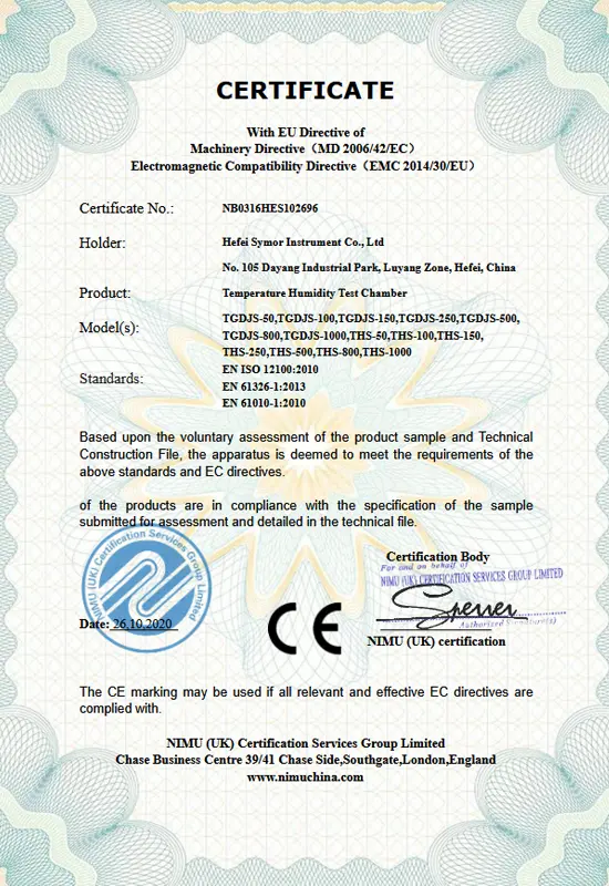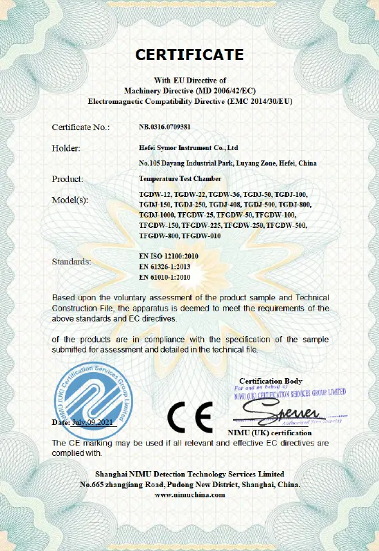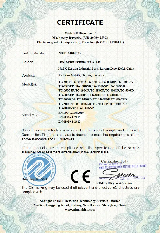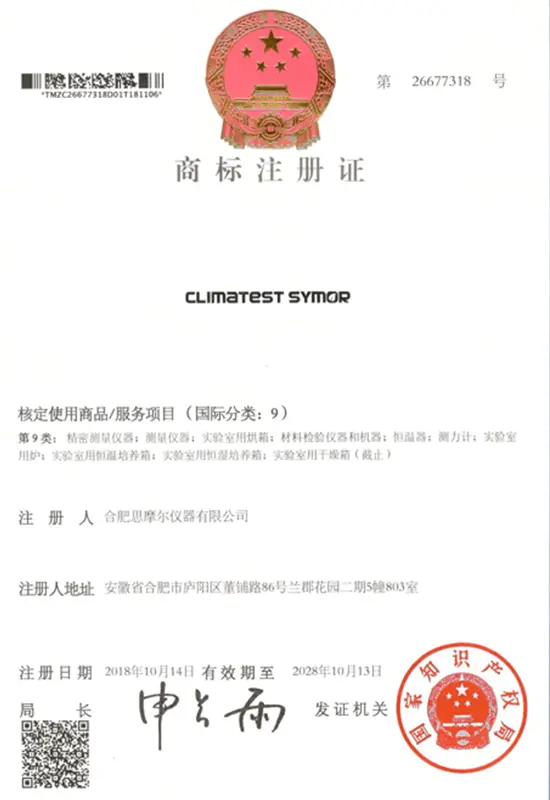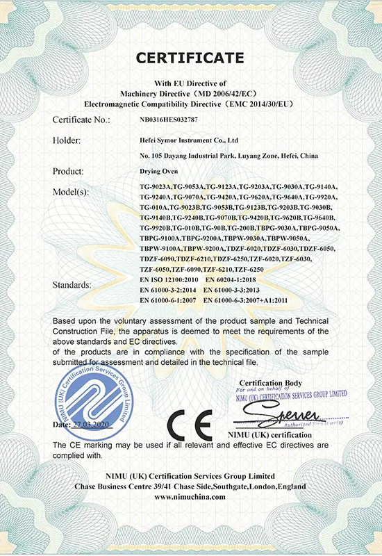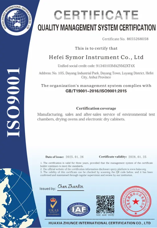 企業の成功は品質につながります。当社は厳格な品質管理システムに基づいて、優れた製品とソリューションを提供することに尽力し、世界中の顧客に付加価値を創造するよう努めています。 Symor Instrument Equipment Co., Ltd は ISO 9001:2015 認証を取得しており、すべての恒温槽と乾燥キャビネットは CE 承認を受けています。